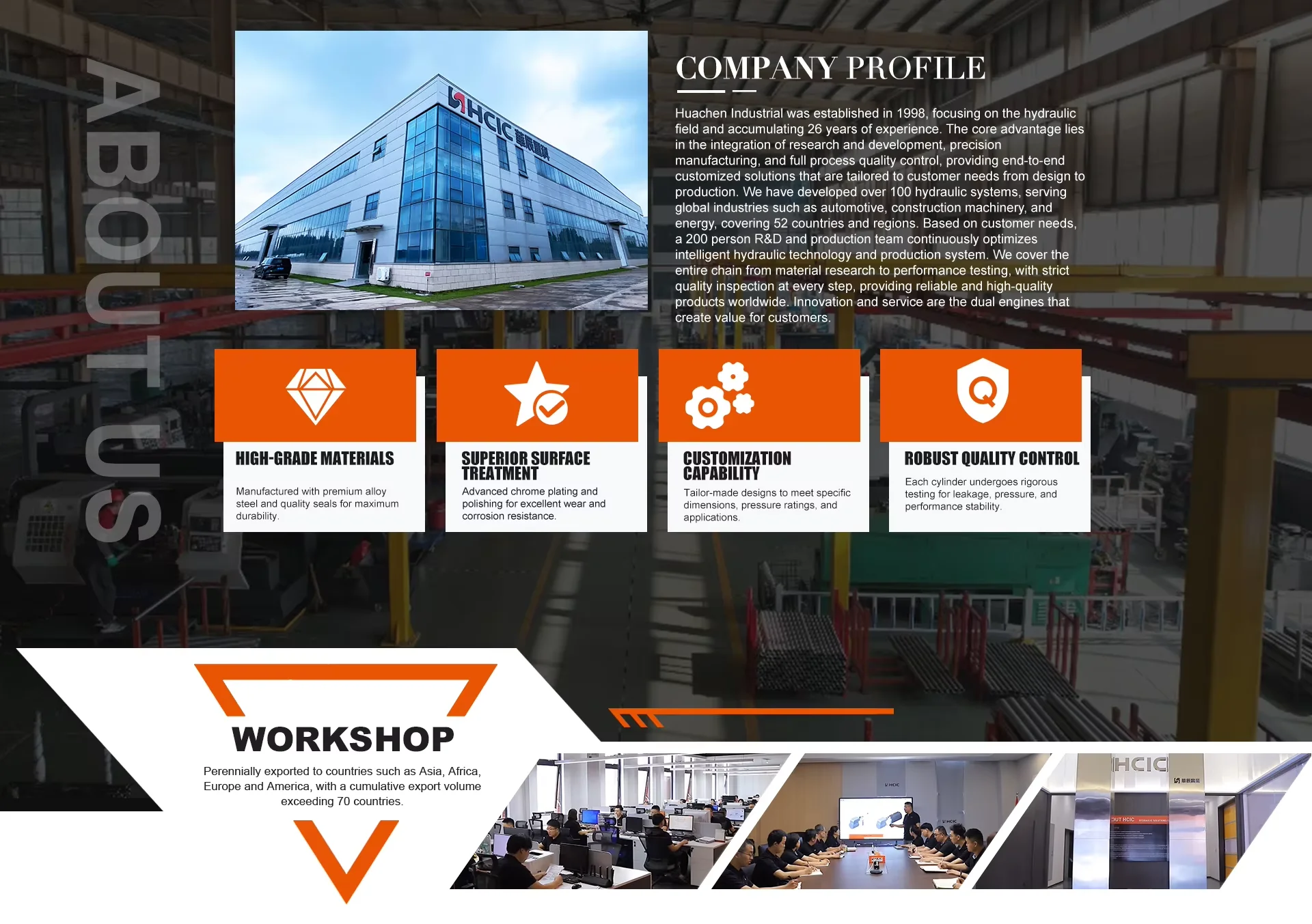 HCIC Hydraulic er en professionel hydraulisk producent med speciale i hydraulisk systemdesign, fremstilling, installation, transformation, idriftsættelse og salg af hydrauliske komponenter. Vi tilbyder tekniske tjenester og er forpligtet til at give vores kunder sikre og pålidelige produkter, der opfylder de mest krævende krav. HCIC-ingeniørteamet arbejder tæt sammen med kunderne for at forstå deres applikationer. Ved at bruge en række gennemprøvede designmetoder og avanceret produktionsudstyr, kombineret med uovertruffen ingeniør- og produktionserfaring, udvikler HCIC Hydraulics sikre og pålidelige hydrauliske cylindre til kritiske applikationer, understøttet af enestående kundeservice. Vi designer, konstruerer og producerer hydrauliske cylindre i en state-of-the-art produktionsfacilitet og overholder vores ISO 9001-2015 certificerede kvalitetsstyringssystem for at sikre produkter af højeste kvalitet til vores kunder.