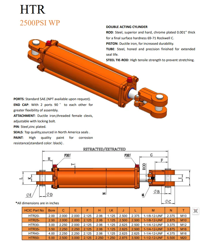 Denne HCIC Standard Clevis Welded Cylinder har en 4" boring, en 36" slaglængde og en 2" diameter stang. Dobbeltvirkende SAE 8 (-08) ORB(F) arbejdsporte 2.500 PSI maksimalt arbejdstryk Gaffelbeslag 1" monteringsstifter medfølger Blanksort maling er holdbar og modstår falmning